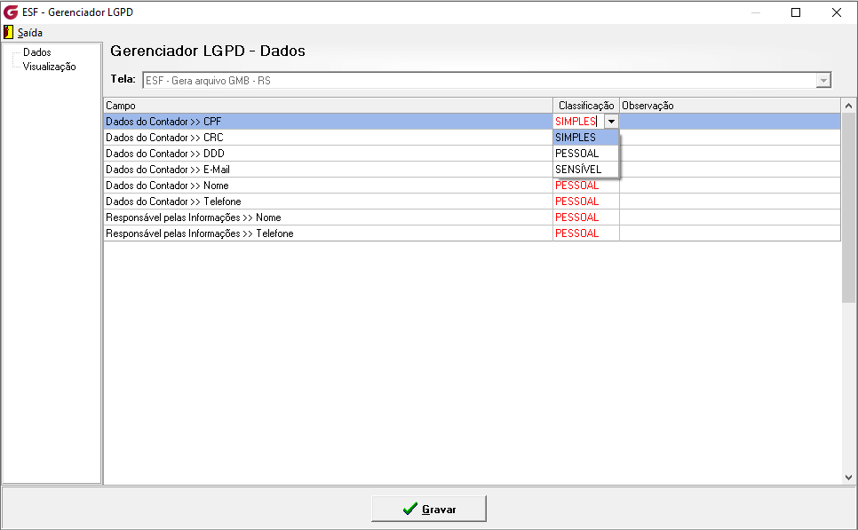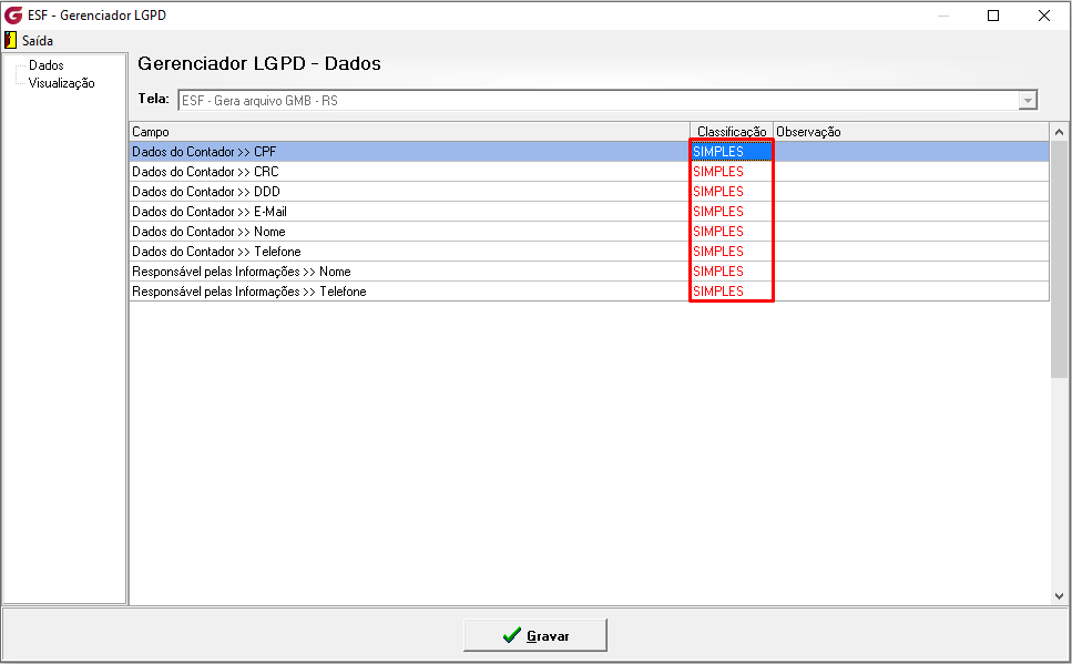 Sempre que escolher aplicar SIMPLES para todos na opção Aplicar Classificação para todos, na Aba Dados, deverá clicar no botão Gravar: