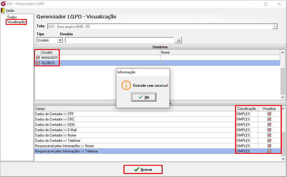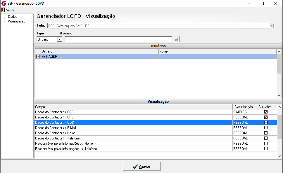 No menu Gerenciador, o responsável poderá configurar a classificação e a visibilidade de cada campo da tela. Serão exibidos todos os campos que possuem ser pessoais e/ou sensíveis, permitindo ao usuário autorizado gerenciar essas configurações conforme necessário, inclusive personalizando as permissões de visualização por usuário ou grupo.