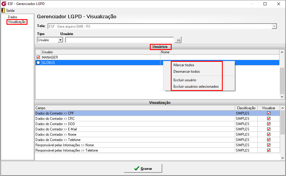 - Excluir usuário – exclui as visualizações alteradas para o usuário marcado e este usuário volta à visualização padrão Globus.