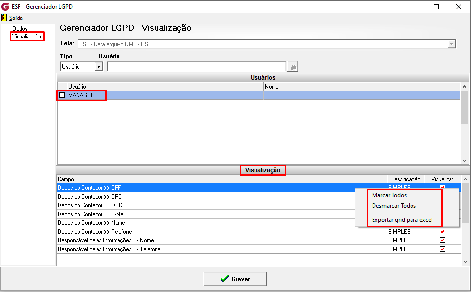 - Marcar Todos – marca o botão visualizar de todos os campos do grid para o usuário.