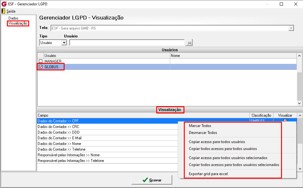 Restringir a visualização nível a campo da tela de Gera arquivo GMB - RS no menu LGPD. |