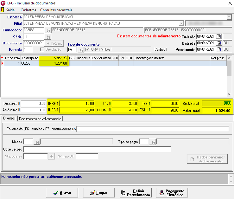 Abaixo iremos demonstrar duas situações que temos na inclusão do documento iniciando com os parâmetros marcados para parcelar junto com o documento de descontos, acréscimos e impostos.