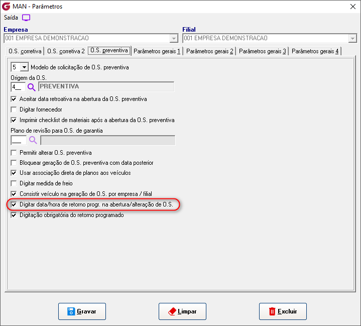 Implementado parâmetro "Digitar data/hora de retorno progr. na abertura/alteração de O.S." na tela Parâmetros>O.S. preventiva. Implementado na impressão de O.S. corretiva modelo 1 e O.S. preventiva modelo 1, a informação de data e hora de ''retorno programado''. Implementado campo para informação de data/hora de retorno programado na abertura de O.S. preventiva. Parâmetros>Manutenção>O.S. preventiva Incluido parâmetro para informar a data/hora do retorno programado.
