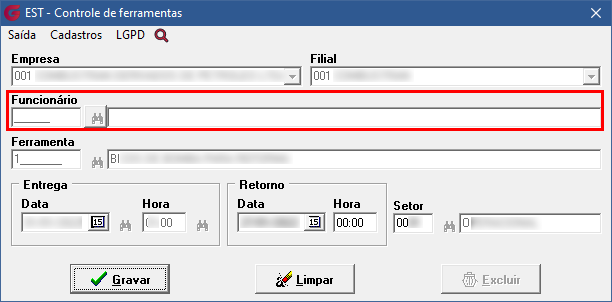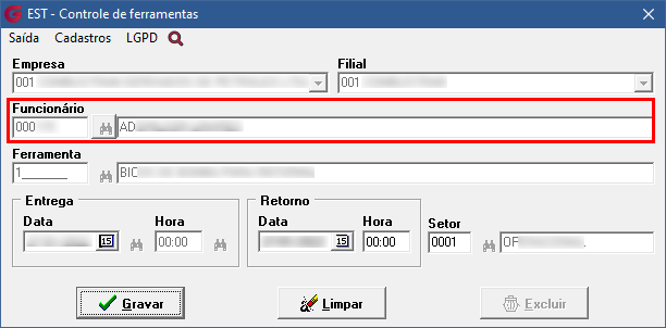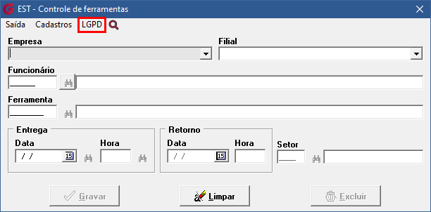 Para configurar as restrições de visualização por campo na tela de Controle de ferramentas, acesse o módulo de Estoque e siga o caminho: Diários > Controle de ferramentas. Em seguida, clique na aba 'LGPD', localizada no canto superior da tela, conforme a imagem abaixo mostra:
