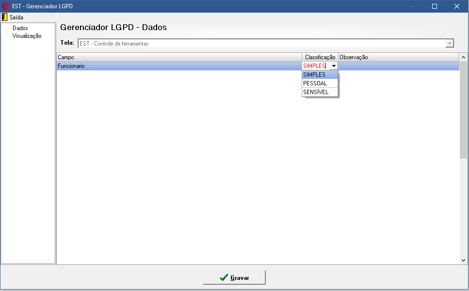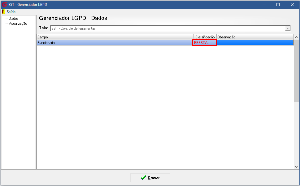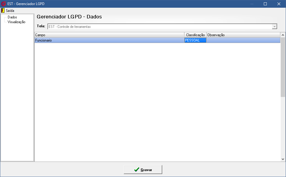 Restringir a visualização nível a campo da tela de Controle de ferramentas no menu LGPD. |