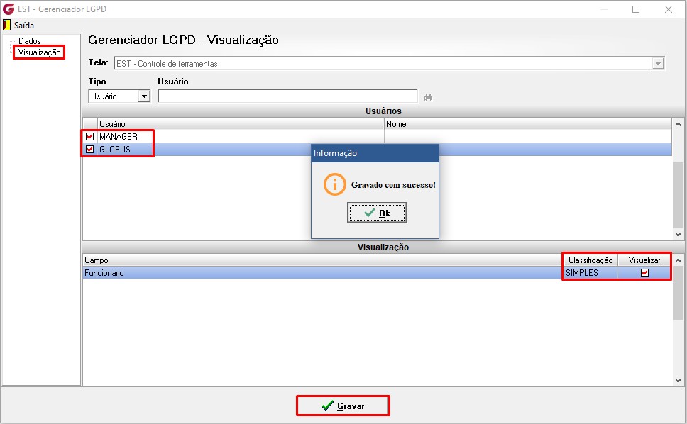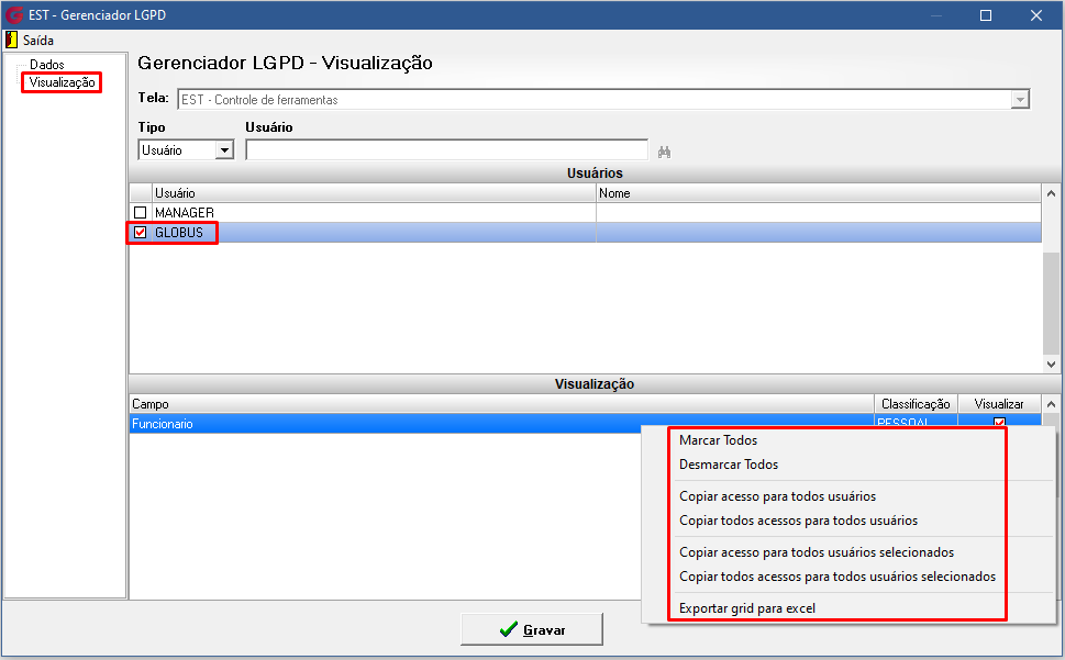 - Excluir usuário – exclui as visualizações alteradas para o usuário marcado e este usuário volta à visualização padrão Globus.