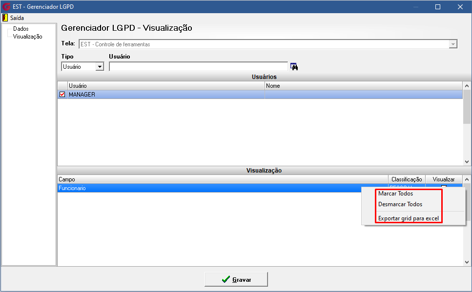 - Marcar Todos – marca o botão visualizar de todos os campos do grid para o usuário.