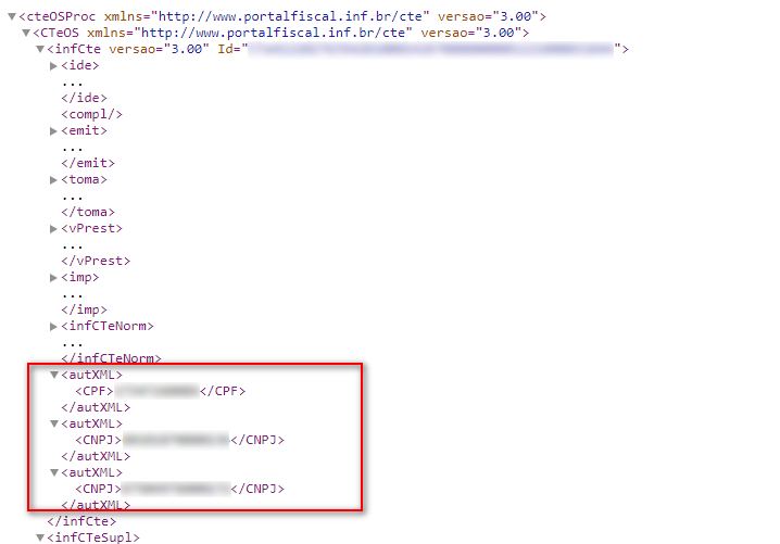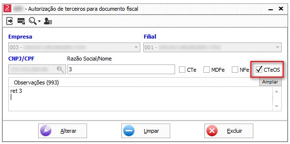Todos os CTes que forem gerados nesta empresa e filial da tela de Autorização de terceiros, terão em seu XML, os CPFs ou CNPJs que estão cadastrados para ela.