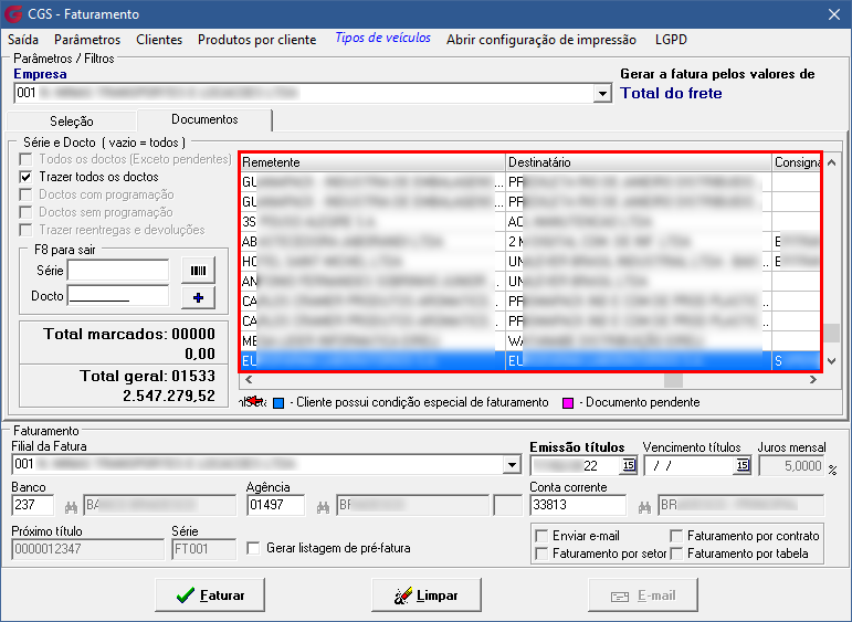 Todos os campos identificados na tela de Faturamento como contendo dados pessoais ou sensíveis de Pessoa Física (PF) estarão sujeitos às regras de visualização a partir da data definida no parâmetro 'Ativar a LGPD'. A exibição ou ocultação desses campos dependerá da classificação aplicada no Gerenciador LGPD.