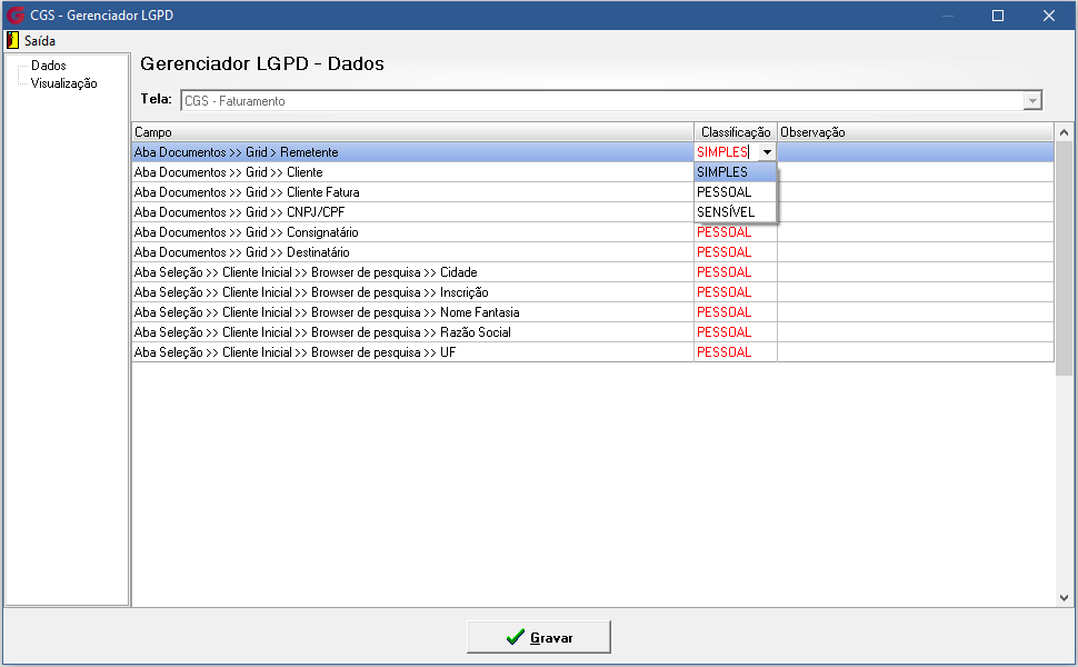 No menu Gerenciador, o responsável poderá configurar a classificação e a visibilidade de cada campo da tela. Serão exibidos todos os campos que possuem ser pessoais e/ou sensíveis, permitindo ao usuário autorizado gerenciar essas configurações conforme necessário, inclusive personalizando as permissões de visualização por usuário ou grupo.