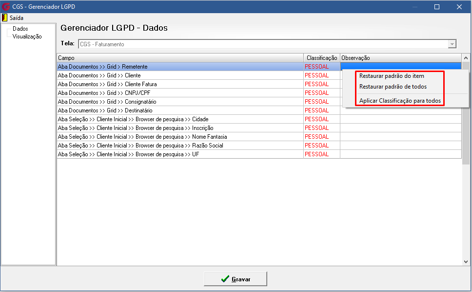 - Restaurar padrão do item – se foi alterado, ao selecionar essa opção o campo volta à classificação padrão Globus.