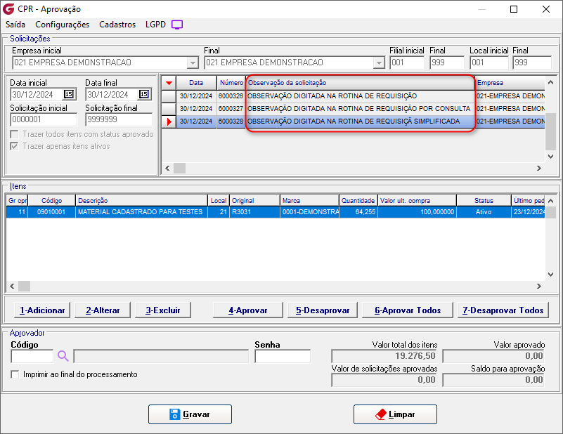 Diários>Saídas>Requisição simplificada ![]() Compras>Cotação>Geração de cotação Na tela de geração de cotação, implementada coluna "Observação da solicitação" no grid de solicitações e a coluna "Observação da aprovação" no grid de itens. ![]() Compras>Painel acompanhamento das solicitações Incluídas as colunas com as observações das solicitações e de aprovação das solicitações.