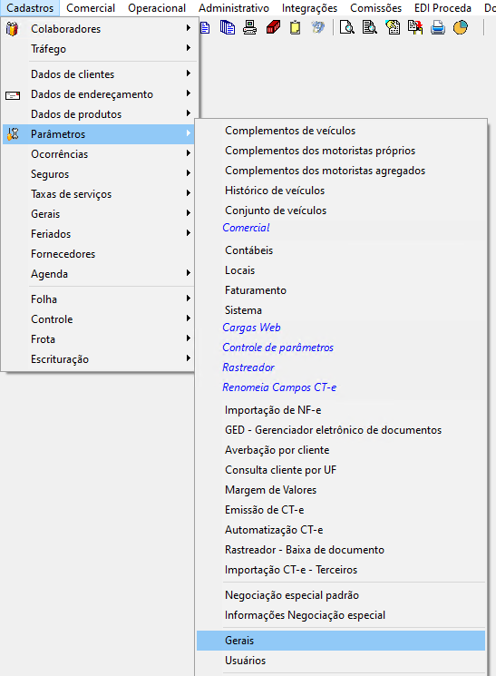 Passo 1: Acessar o cadastro de parâmetros gerais do Cargas (Cadastros > Parâmetros > Gerais)