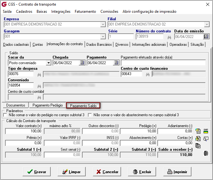 Com o parâmetro marcado os campos das abas de pagamento de saldo e pagamento adiantamento caso houver precisar ser preenchido para a gravação do contrato.