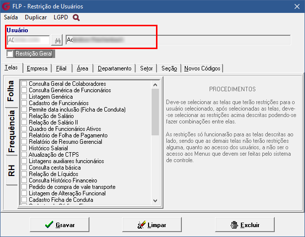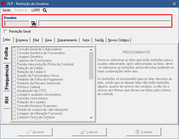 Restringir a visualização nível a campo da tela de Restrição de Usuários no menu LGPD. |