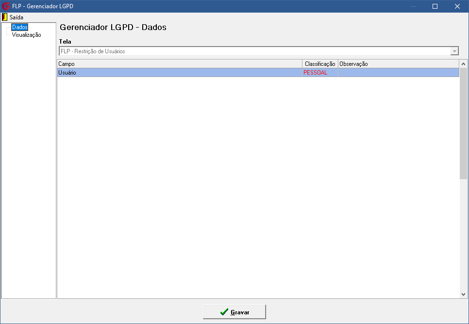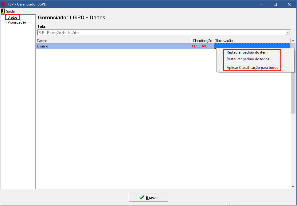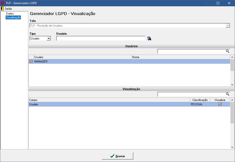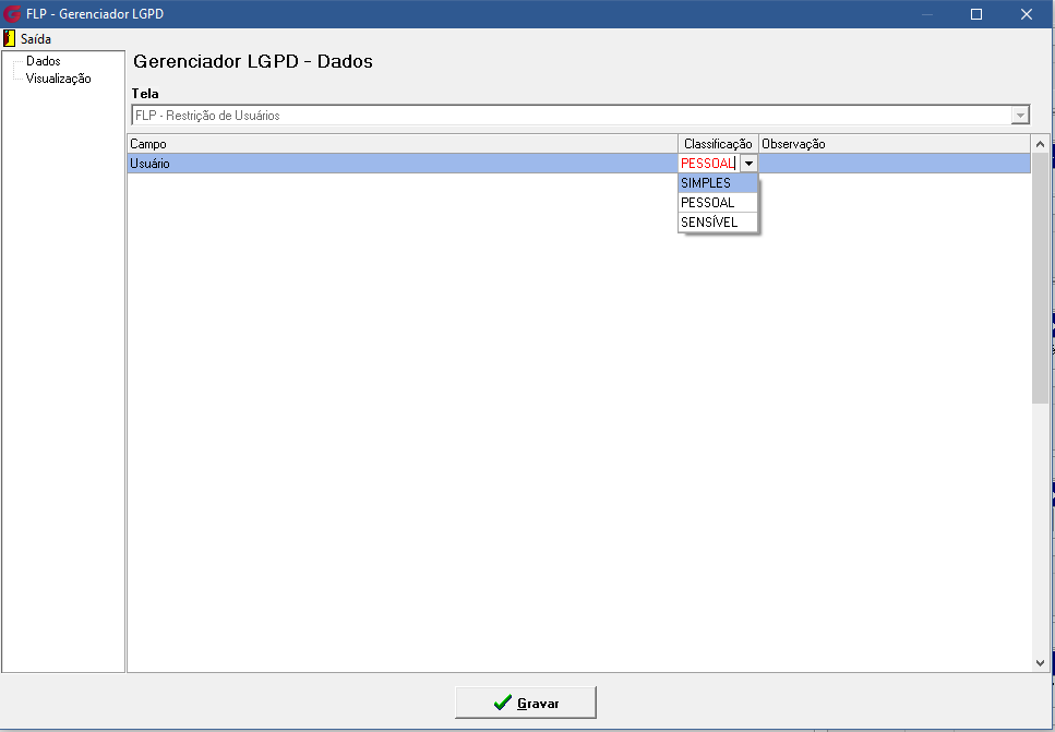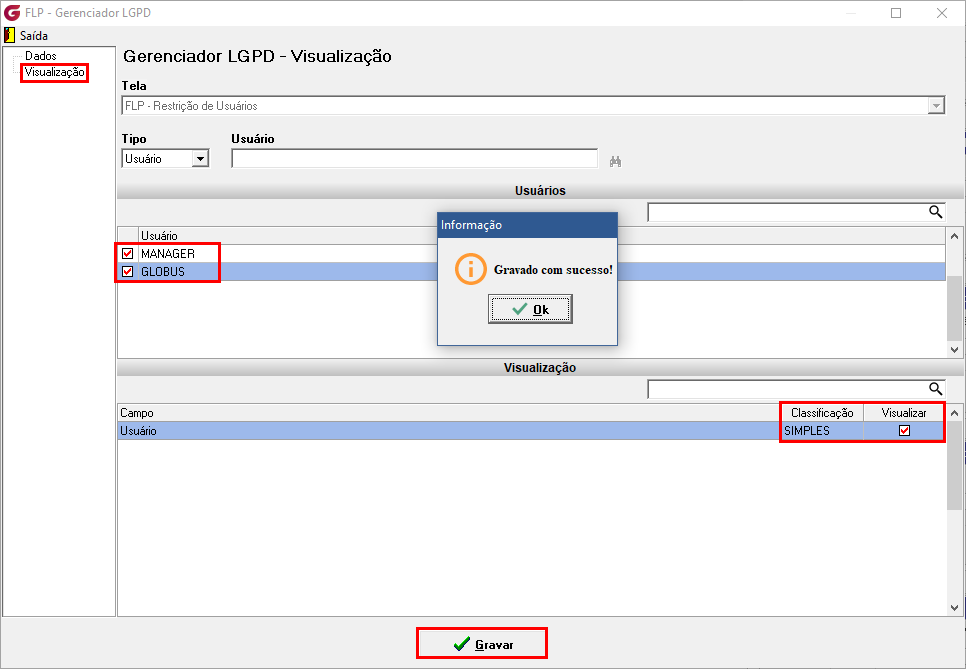 Ao definir a classificação de um campo como SIMPLES, todos os usuários selecionados terão automaticamente a visualização habilitada para esse campo na aba Visualização. Se desejar, você pode incluir novos usuários, que também terão a opção de visualização ativada para o campo marcado como SIMPLES. Após realizar todas as configurações, clique em Gravar para garantir que as alterações sejam salvas e aplicadas corretamente.