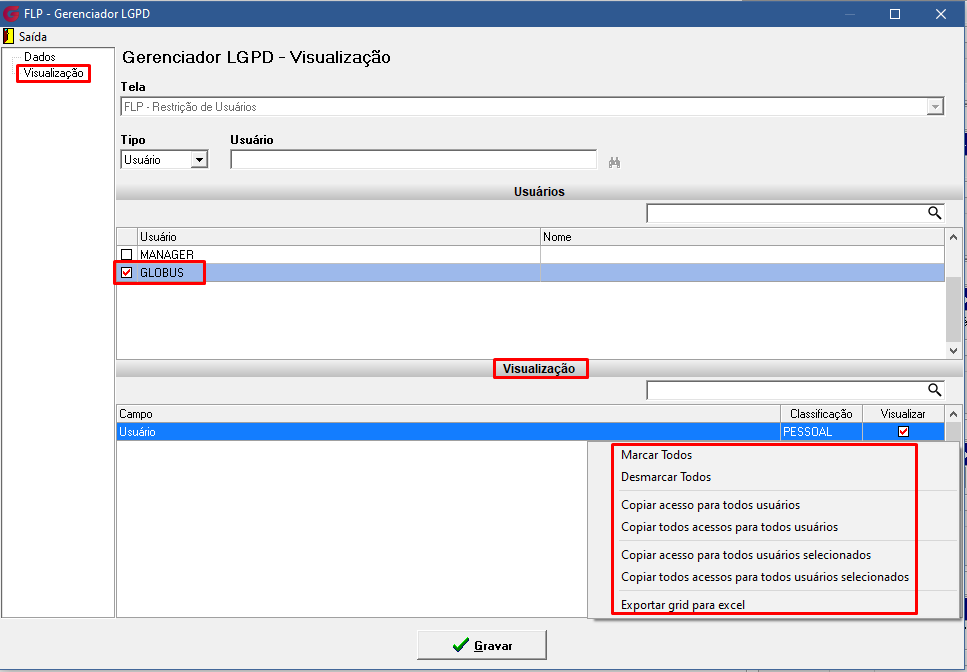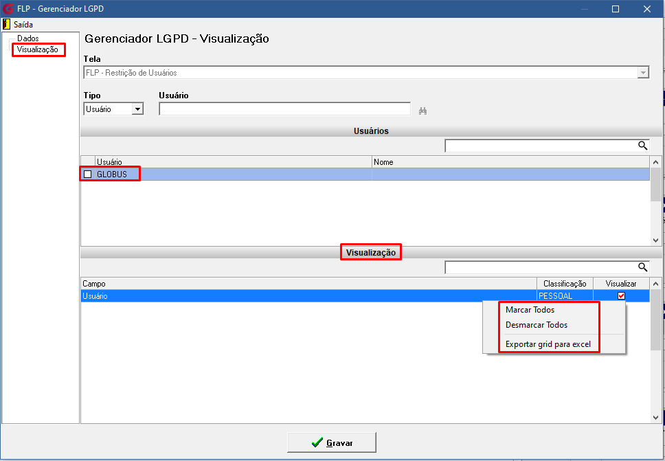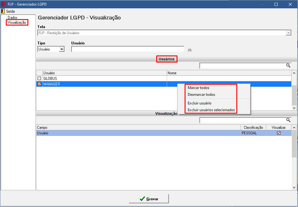 - Excluir usuário – exclui as visualizações alteradas para o usuário marcado e este usuário volta à visualização padrão Globus.