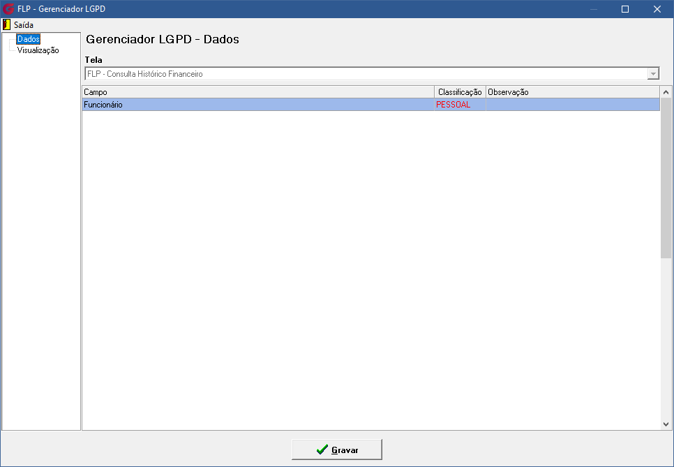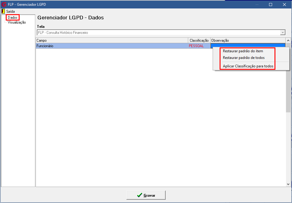 Restringir a visualização nível a campo da tela de Consulta Histórico Financeiro no menu LGPD. |