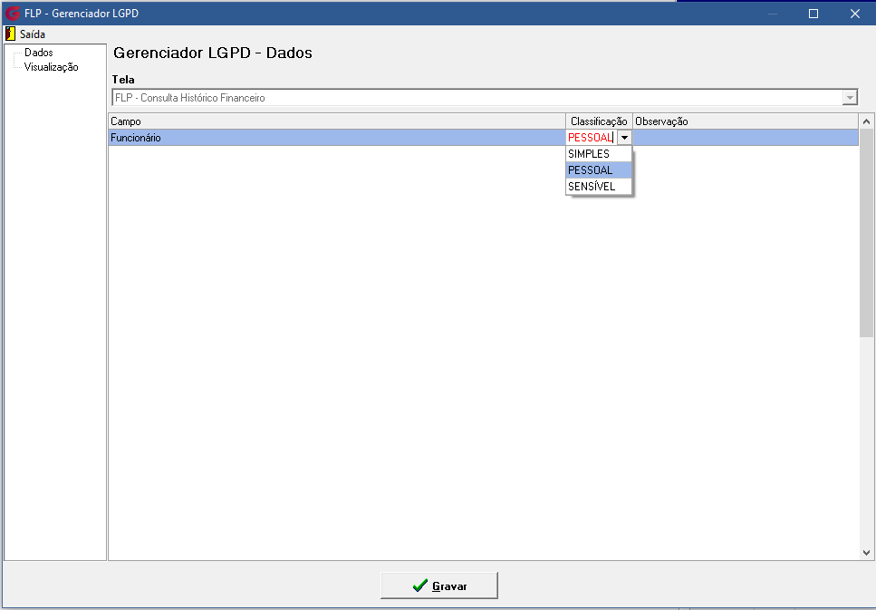 No menu Gerenciador, o responsável poderá configurar a classificação e a visibilidade de cada campo da tela. Serão exibidos todos os campos que possuem ser pessoais e/ou sensíveis, permitindo ao usuário autorizado gerenciar essas configurações conforme necessário, inclusive personalizando as permissões de visualização por usuário ou grupo.