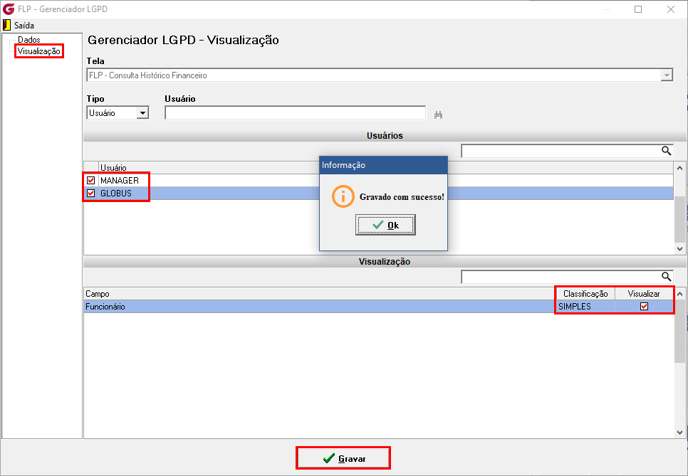 Ao definir a classificação de um campo como SIMPLES, todos os usuários selecionados terão automaticamente a visualização habilitada para esse campo na aba Visualização. Se desejar, você pode incluir novos usuários, que também terão a opção de visualização ativada para o campo marcado como SIMPLES. Após realizar todas as configurações, clique em Gravar para garantir que as alterações sejam salvas e aplicadas corretamente.