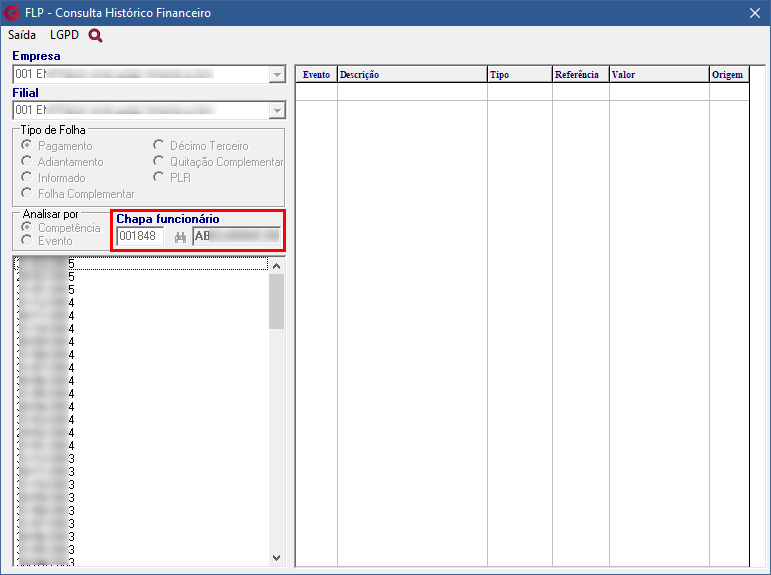 Todos os campos identificados na tela de Consulta Histórico Financeiro como contendo dados pessoais ou sensíveis de Pessoa Física (PF) estarão sujeitos às regras de visualização a partir da data definida no parâmetro 'Ativar a LGPD'. A exibição ou ocultação desses campos dependerá da classificação aplicada no Gerenciador LGPD.