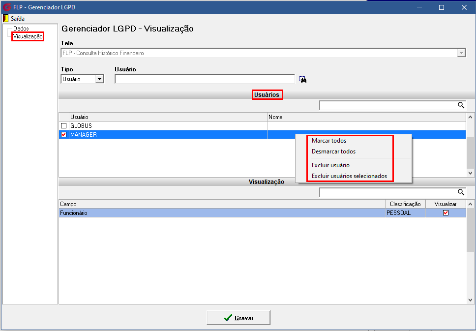 - Excluir usuário – exclui as visualizações alteradas para o usuário marcado e este usuário volta à visualização padrão Globus.