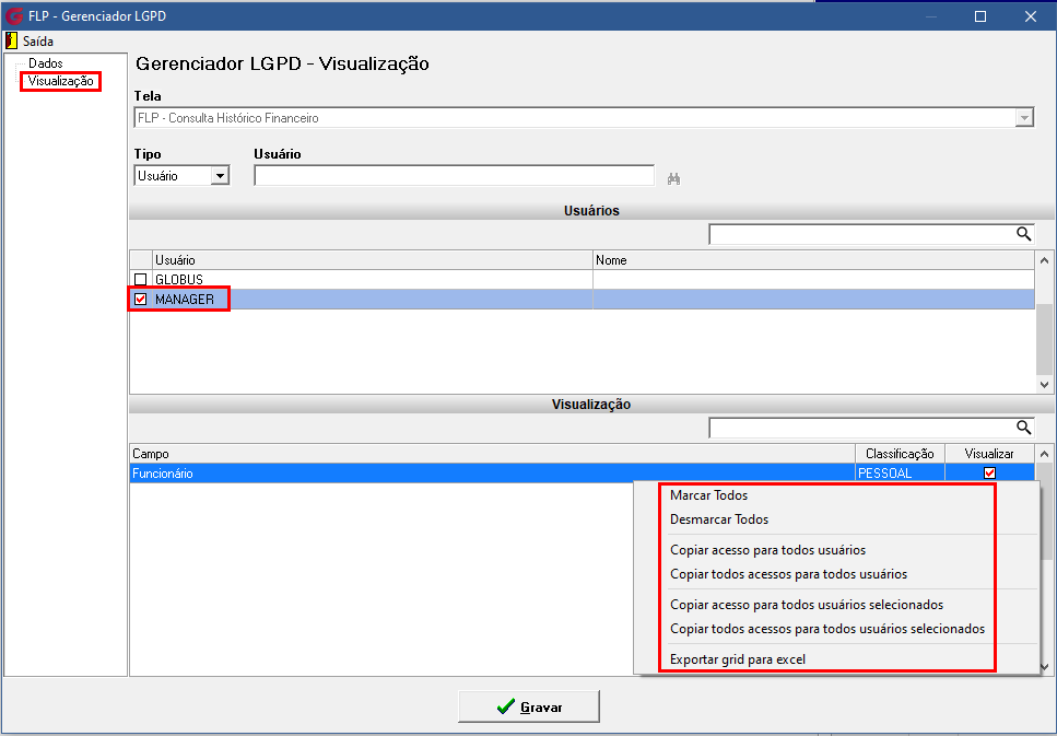 - Marcar Todos – marca o botão visualizar de todos os campos do grid para o usuário.