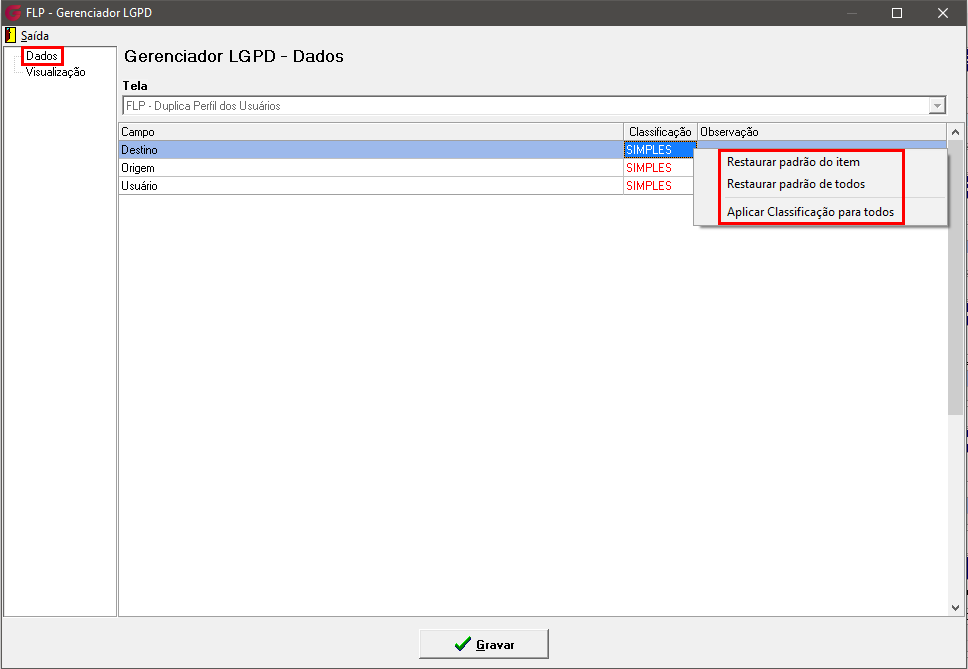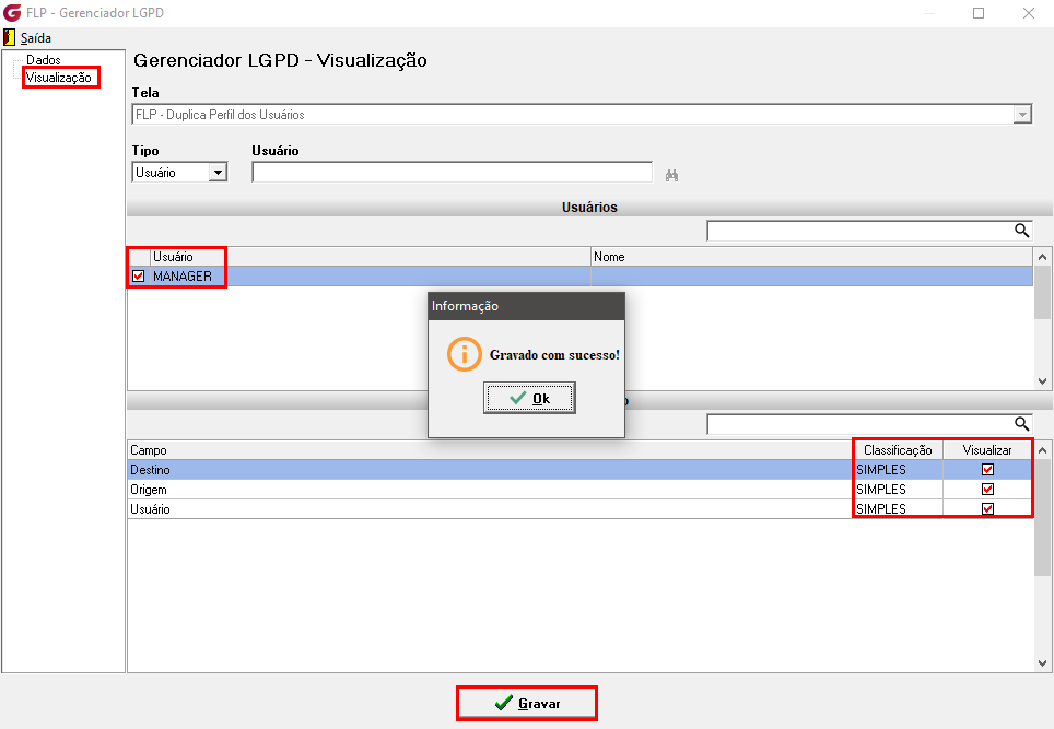 Ao definir a classificação de um campo como SIMPLES na aba 'Dados', todos os usuários selecionados terão automaticamente a visualização habilitada para esse campo na aba 'Visualização'. Se desejar, você pode incluir novos usuários, que também terão a opção de visualização ativada para o campo marcado como SIMPLES. Após realizar todas as configurações, clique em Gravar para garantir que as alterações sejam salvas e aplicadas corretamente.