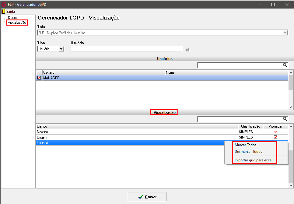 - Marcar Todos – marca o botão visualizar de todos os campos do grid para o usuário.