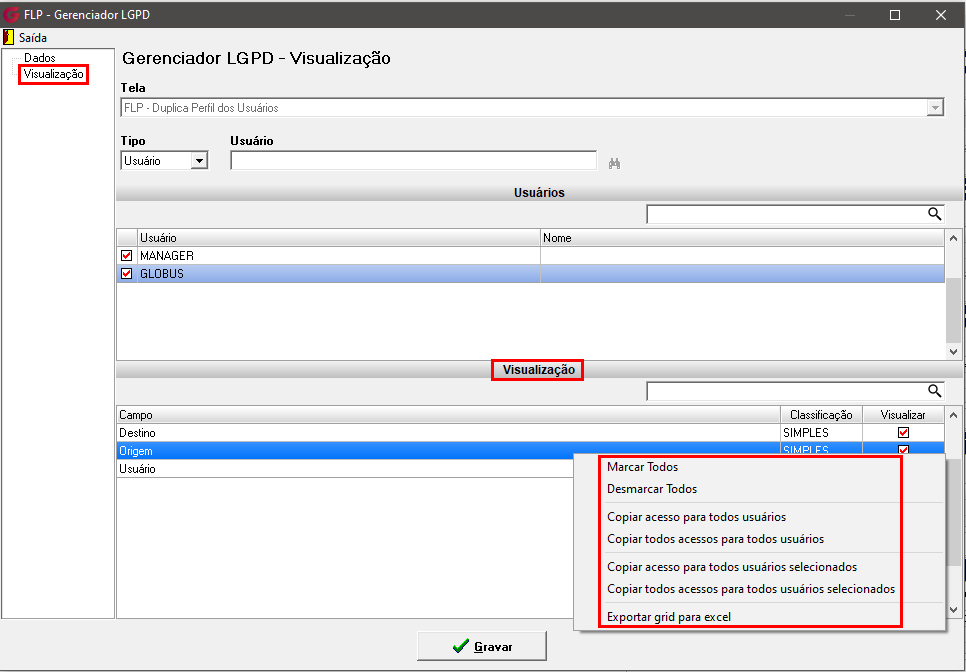 - Excluir usuário – exclui as visualizações alteradas para o usuário marcado e este usuário volta à visualização padrão Globus.