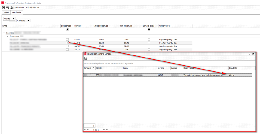Ao tentar gerar a cópia da escala com os parâmetros de “Alerta” ou “Bloqueia” marcados, o sistema exibe um grid descrevendo a situação do veículo.