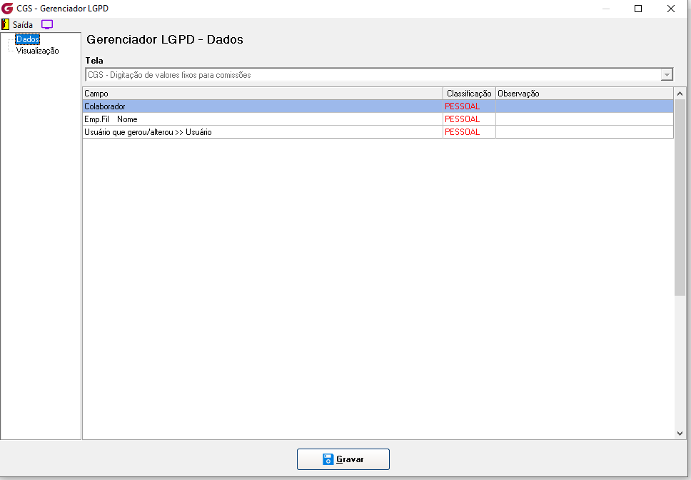 No menu Gerenciador, o responsável poderá configurar a classificação e a visibilidade de cada campo da tela. Serão exibidos todos os campos que possuem ser pessoais e/ou sensíveis, permitindo ao usuário autorizado gerenciar essas configurações conforme necessário, inclusive personalizando as permissões de visualização por usuário ou grupo.