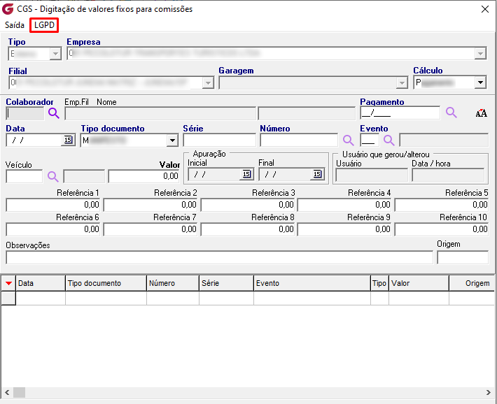 Todos os campos identificados na tela de Digitação de valores fixos para comissões como contendo dados pessoais ou sensíveis de Pessoa Física (PF) estarão sujeitos às regras de visualização a partir da data definida no parâmetro 'Ativar a LGPD'. A exibição ou ocultação desses campos dependerá da classificação aplicada no Gerenciador LGPD.
