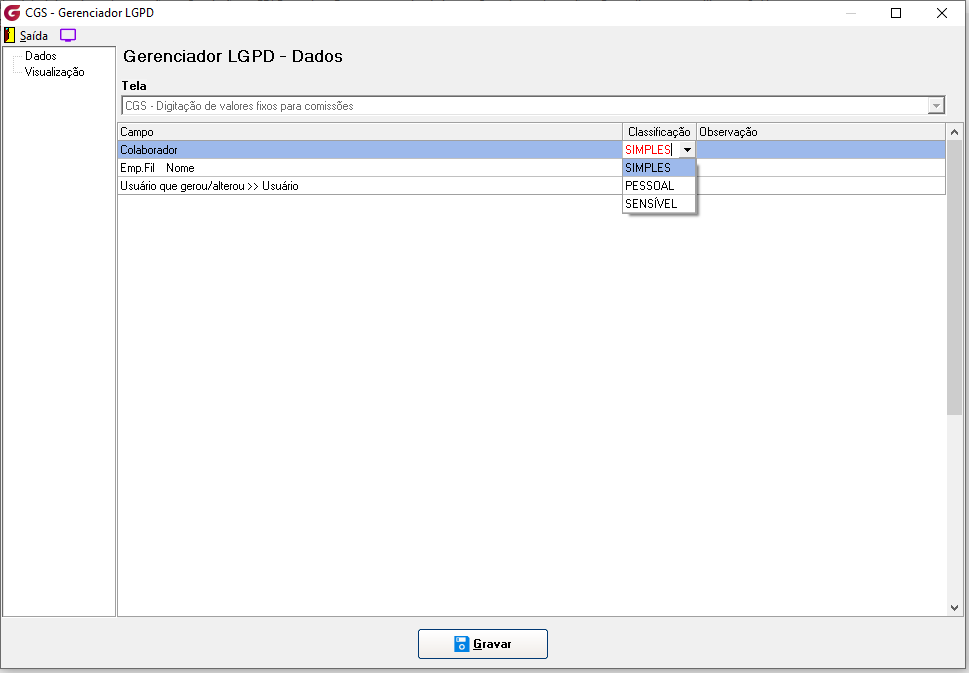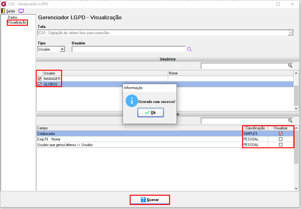 Ao definir a classificação de um campo como SIMPLES na aba 'Dados', todos os usuários selecionados terão automaticamente a visualização habilitada para esse campo na aba 'Visualização'. Se desejar, você pode incluir novos usuários, que também terão a opção de visualização ativada para o campo marcado como SIMPLES. Após realizar todas as configurações, clique em Gravar para garantir que as alterações sejam salvas e aplicadas corretamente.