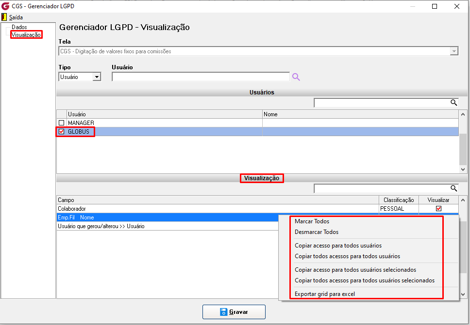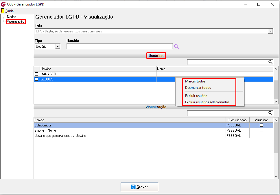 - Excluir usuário – exclui as visualizações alteradas para o usuário marcado e este usuário volta à visualização padrão Globus.