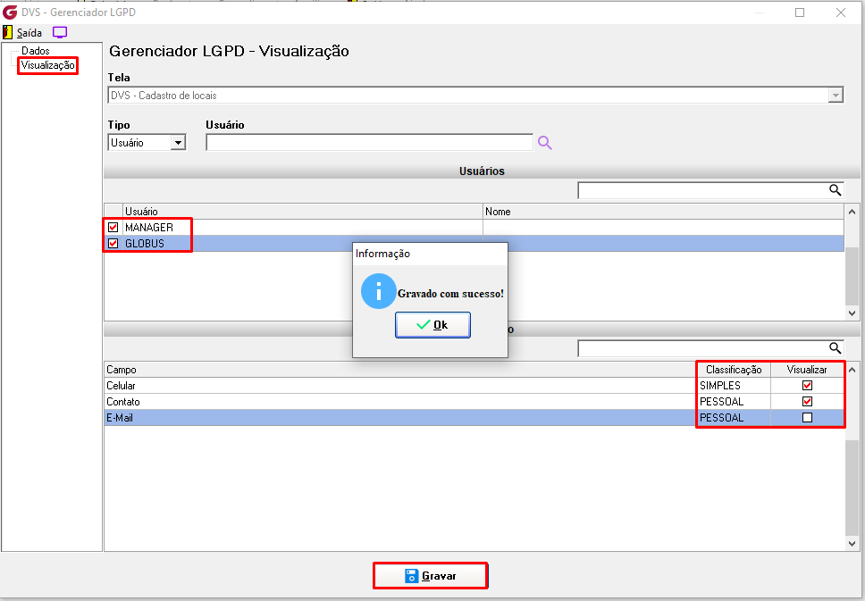 Ao definir a classificação de um campo como SIMPLES na aba 'Dados', todos os usuários selecionados terão automaticamente a visualização habilitada para esse campo na aba 'Visualização'. Se desejar, você pode incluir novos usuários, que também terão a opção de visualização ativada para o campo marcado como SIMPLES. Após realizar todas as configurações, clique em Gravar para garantir que as alterações sejam salvas e aplicadas corretamente.