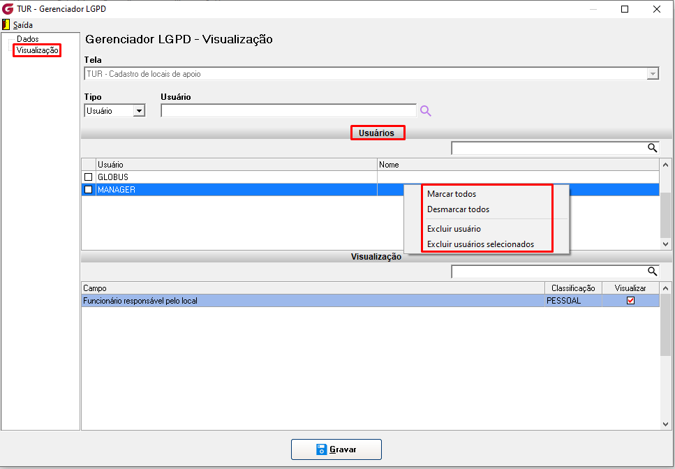 - Excluir usuário – exclui as visualizações alteradas para o usuário marcado e este usuário volta à visualização padrão Globus.