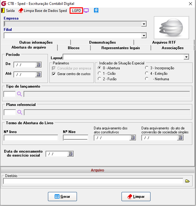 Para configurar as restrições de visualização por campo na tela de Sped-Escrituração Contábil Digital, acesse o módulo de Contabilidade e siga o caminho: Rotinas auxiliares > Arquivos digitais > SPED - ECD. Em seguida, clique na aba 'LGPD', localizada no canto superior da tela, conforme a imagem abaixo mostra: