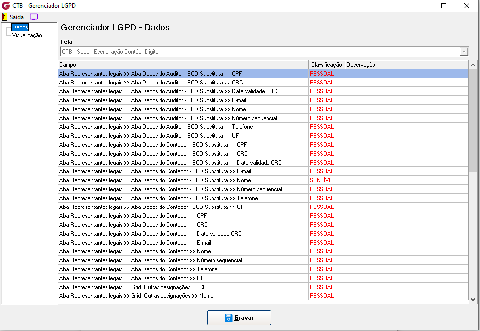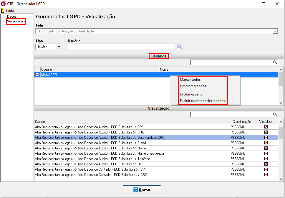 No menu Gerenciador, o responsável poderá configurar a classificação e a visibilidade de cada campo da tela. Serão exibidos todos os campos que possuem ser pessoais e/ou sensíveis, permitindo ao usuário autorizado gerenciar essas configurações conforme necessário, inclusive personalizando as permissões de visualização por usuário ou grupo.