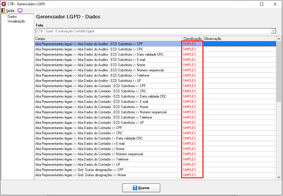 Sempre que escolher aplicar SIMPLES para todos na opção Aplicar Classificação para todos, na Aba Dados, deverá clicar no botão Gravar: