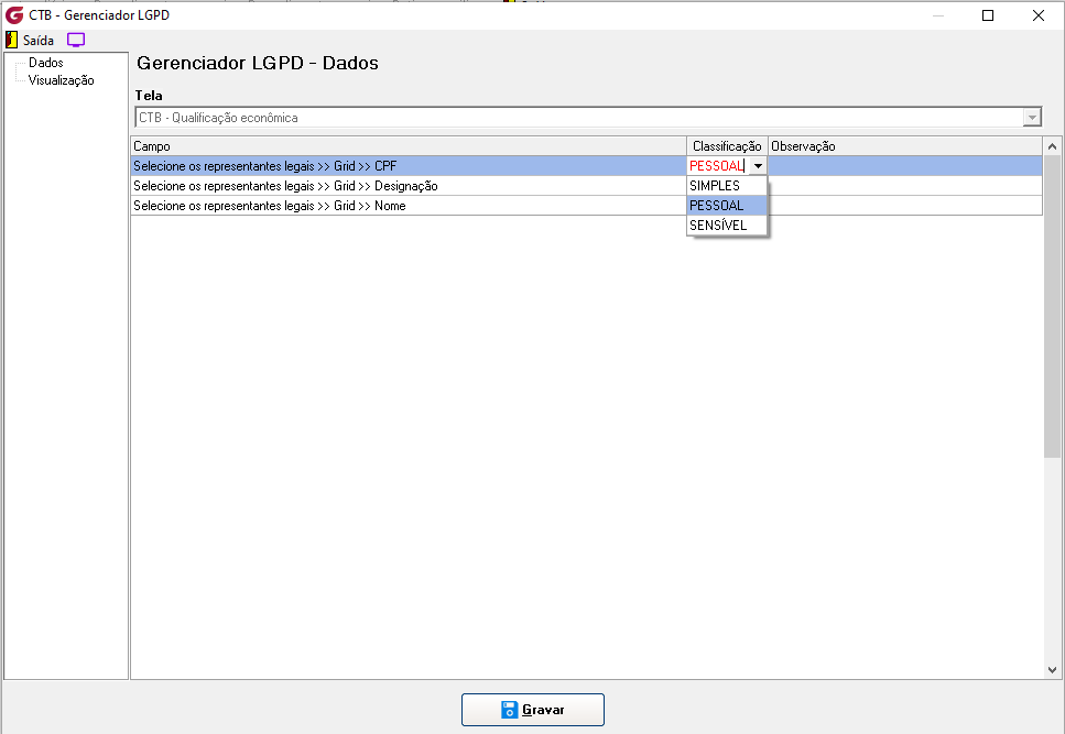 No menu Gerenciador, o responsável poderá configurar a classificação e a visibilidade de cada campo da tela. Serão exibidos todos os campos que possuem ser pessoais e/ou sensíveis, permitindo ao usuário autorizado gerenciar essas configurações conforme necessário, inclusive personalizando as permissões de visualização por usuário ou grupo.