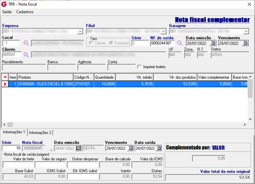 Complementar para as notas do tipo Complementar (Saída/Entrada), na