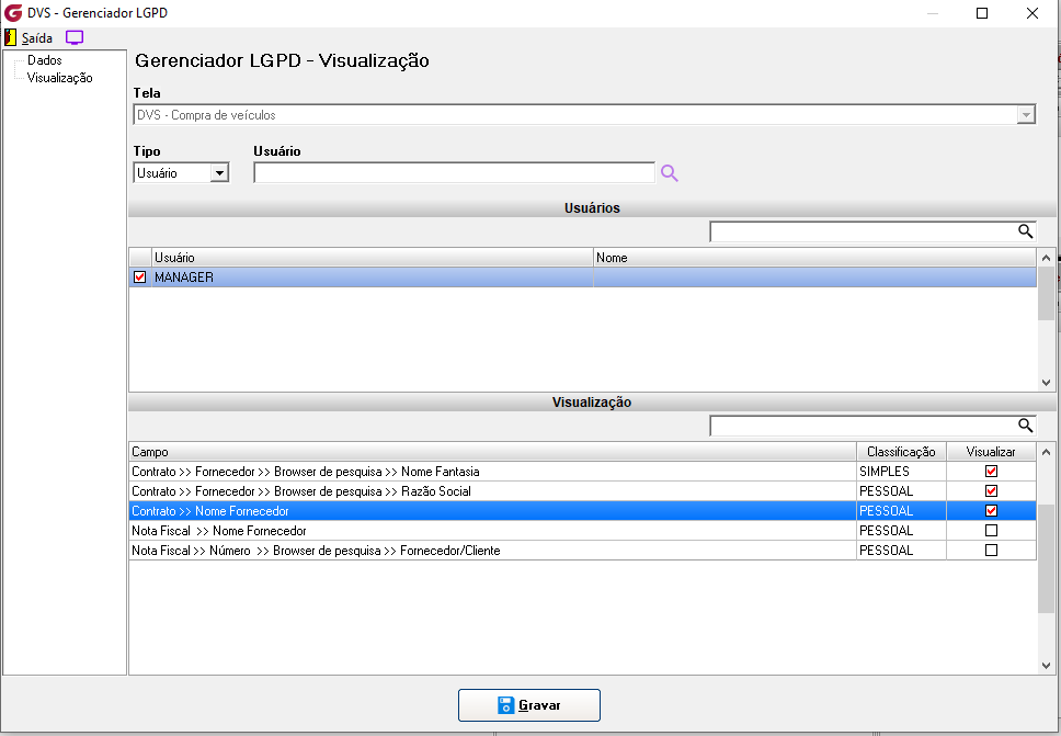 No menu Gerenciador, o responsável poderá configurar a classificação e a visibilidade de cada campo da tela. Serão exibidos todos os campos que possuem ser pessoais e/ou sensíveis, permitindo ao usuário autorizado gerenciar essas configurações conforme necessário, inclusive personalizando as permissões de visualização por usuário ou grupo.