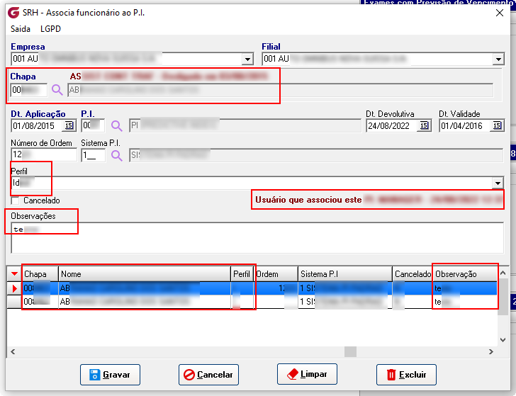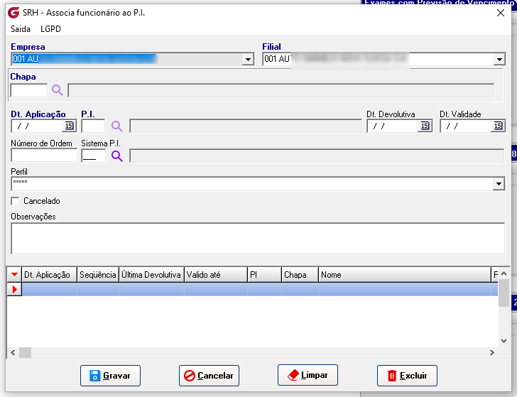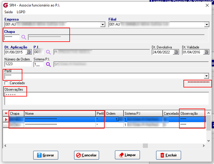 Todos os campos identificados na tela de Associa funcionário ao P.I como contendo dados pessoais ou sensíveis de Pessoa Física (PF) estarão sujeitos às regras de visualização a partir da data definida no parâmetro 'Ativar a LGPD'. A exibição ou ocultação desses campos dependerá da classificação aplicada no Gerenciador LGPD.