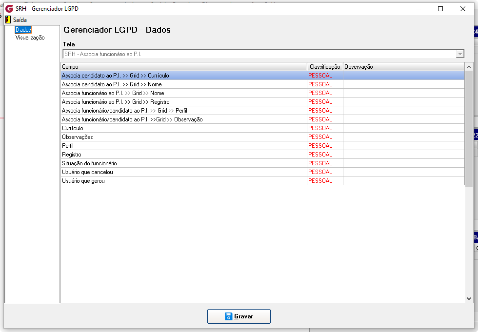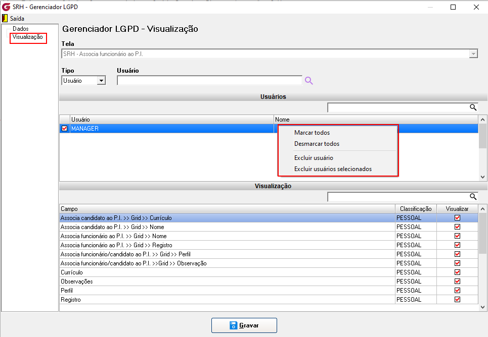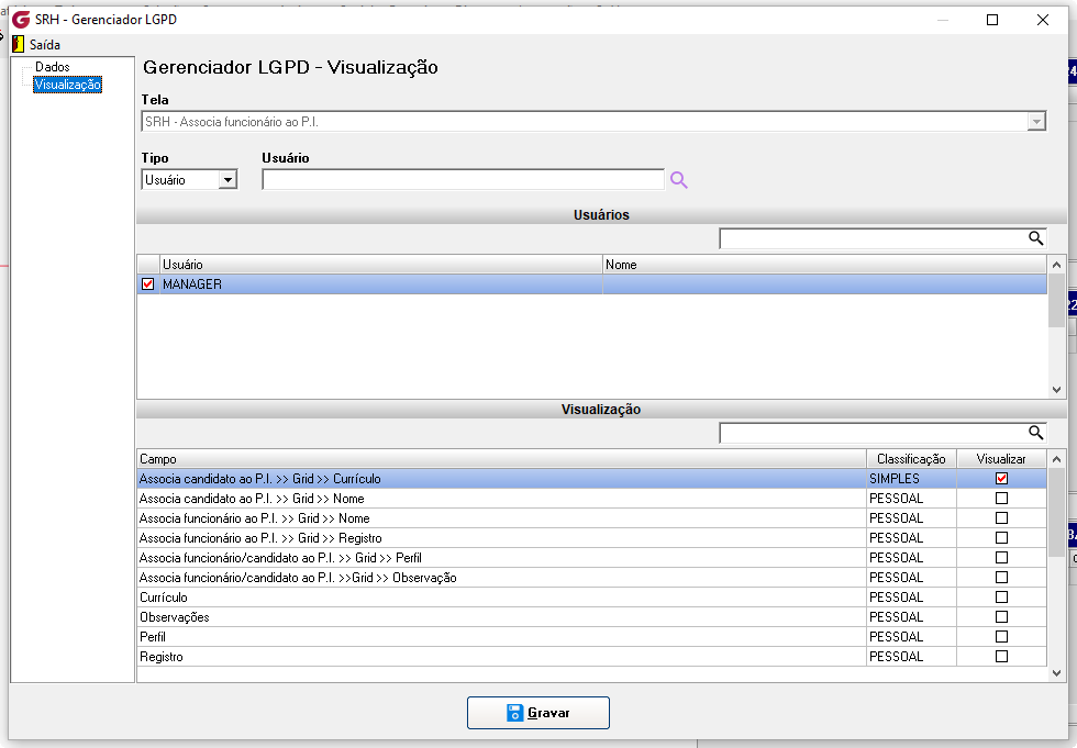 No menu Gerenciador, o responsável poderá configurar a classificação e a visibilidade de cada campo da tela. Serão exibidos todos os campos que possuem ser pessoais e/ou sensíveis, permitindo ao usuário autorizado gerenciar essas configurações conforme necessário, inclusive personalizando as permissões de visualização por usuário ou grupo.