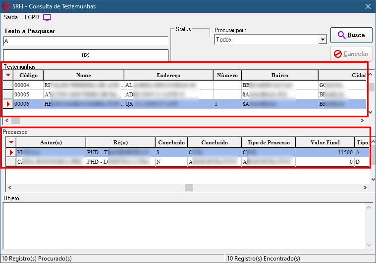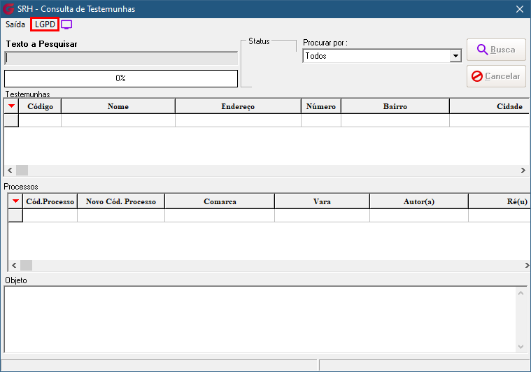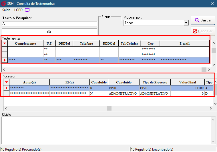 Todos os campos identificados na tela de Consulta de Testemunhas como contendo dados pessoais ou sensíveis de Pessoa Física (PF) estarão sujeitos às regras de visualização a partir da data definida no parâmetro 'Ativar a LGPD'. A exibição ou ocultação desses campos dependerá da classificação aplicada no Gerenciador LGPD.