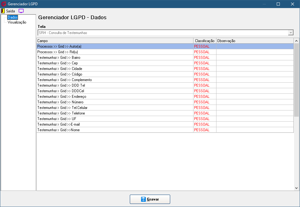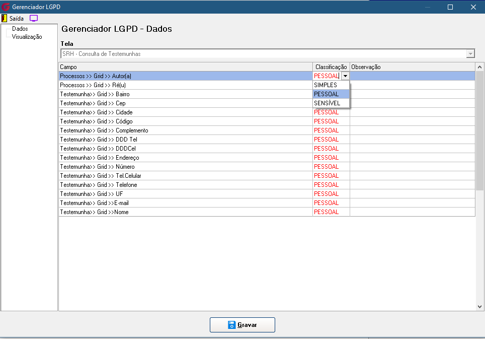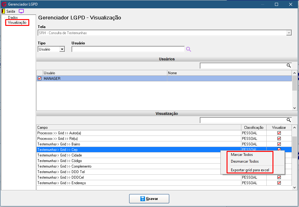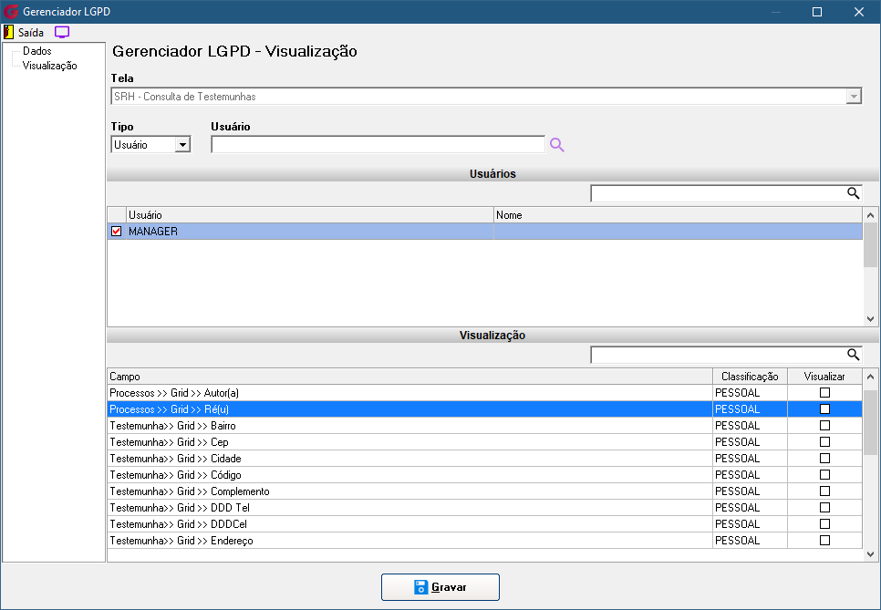 No menu Gerenciador, o responsável poderá configurar a classificação e a visibilidade de cada campo da tela. Serão exibidos todos os campos que possuem ser pessoais e/ou sensíveis, permitindo ao usuário autorizado gerenciar essas configurações conforme necessário, inclusive personalizando as permissões de visualização por usuário ou grupo.