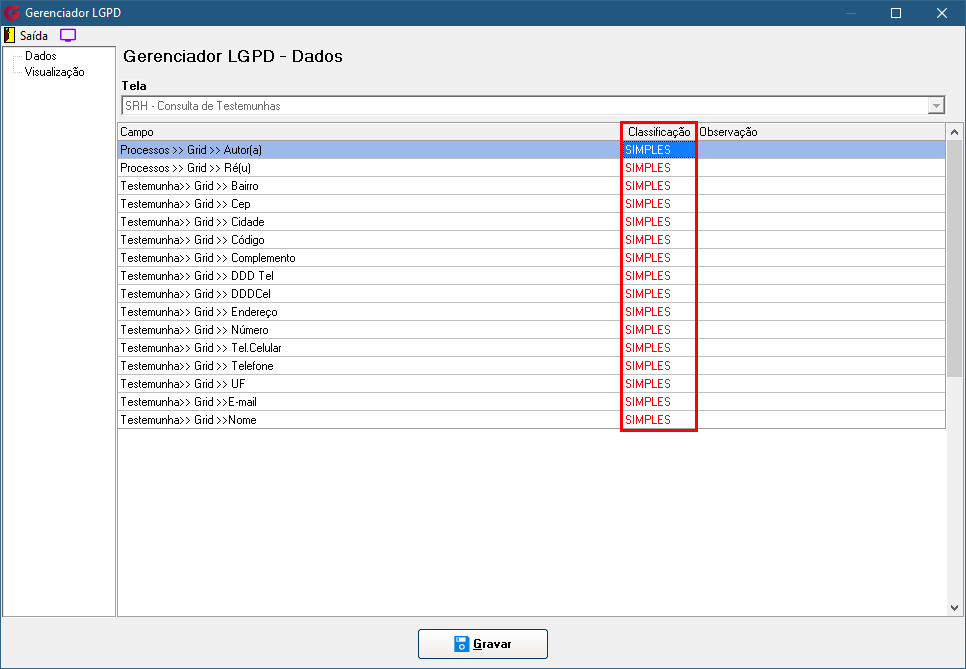 Sempre que escolher aplicar SIMPLES para todos na opção Aplicar Classificação para todos, na Aba Dados, deverá clicar no botão Gravar: