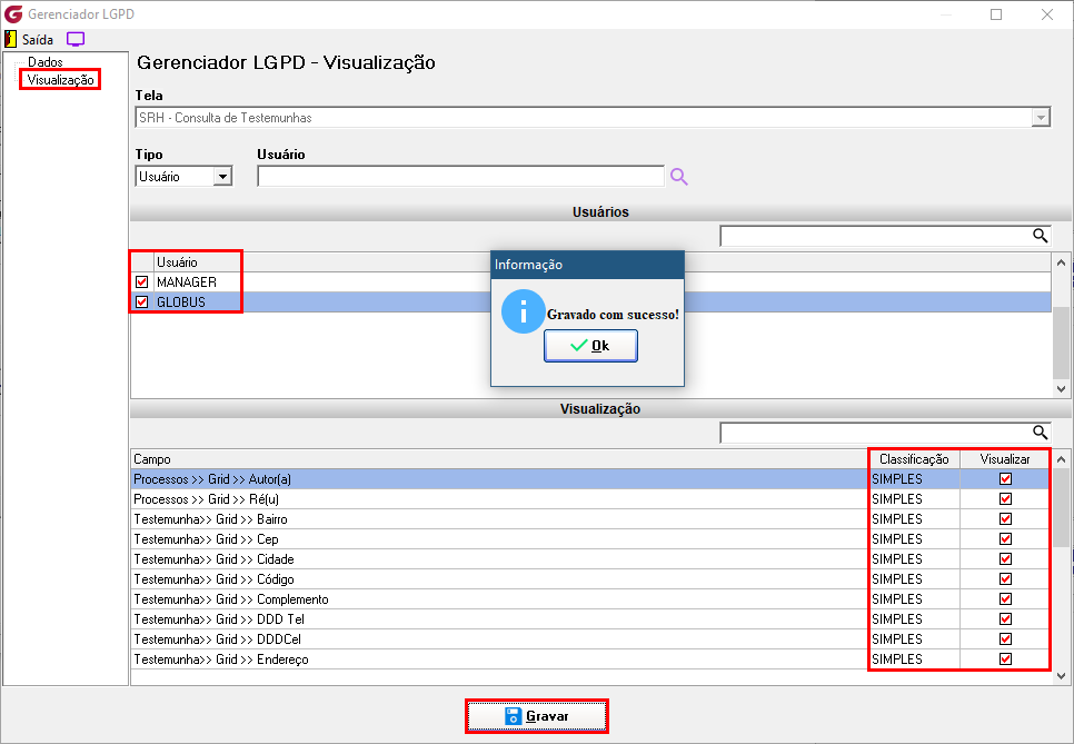Após essa configuração, na aba Visualização, será possível verificar que todos os usuários selecionados terão a visualização ativa para os campos classificados como SIMPLES na aba "Dados".