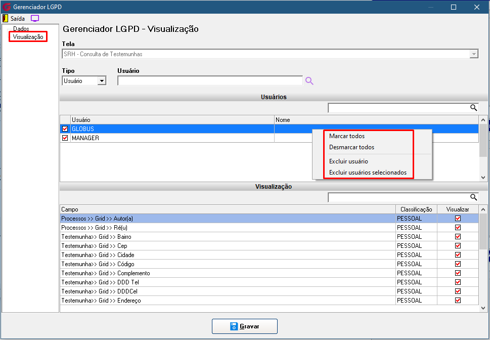 - Excluir usuário – exclui as visualizações alteradas para o usuário marcado e este usuário volta à visualização padrão Globus.